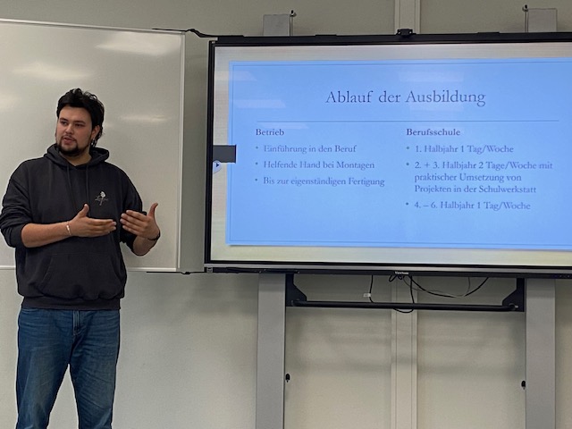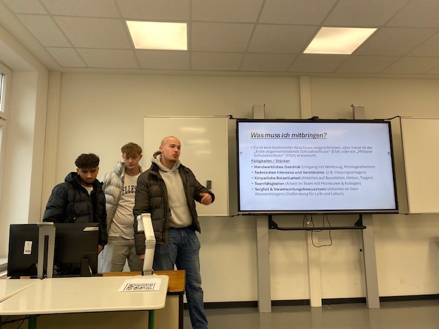 Die Technikklassen erhielten inspirierende Impulse zu Berufen wie Anlagenmechaniker/in in Sanitär-, Heizungs- und Klimatechnik, inklusive praktischer Beispiele aus realen Projekten, Einsatzgebiete und typischer Arbeitsabläufe.